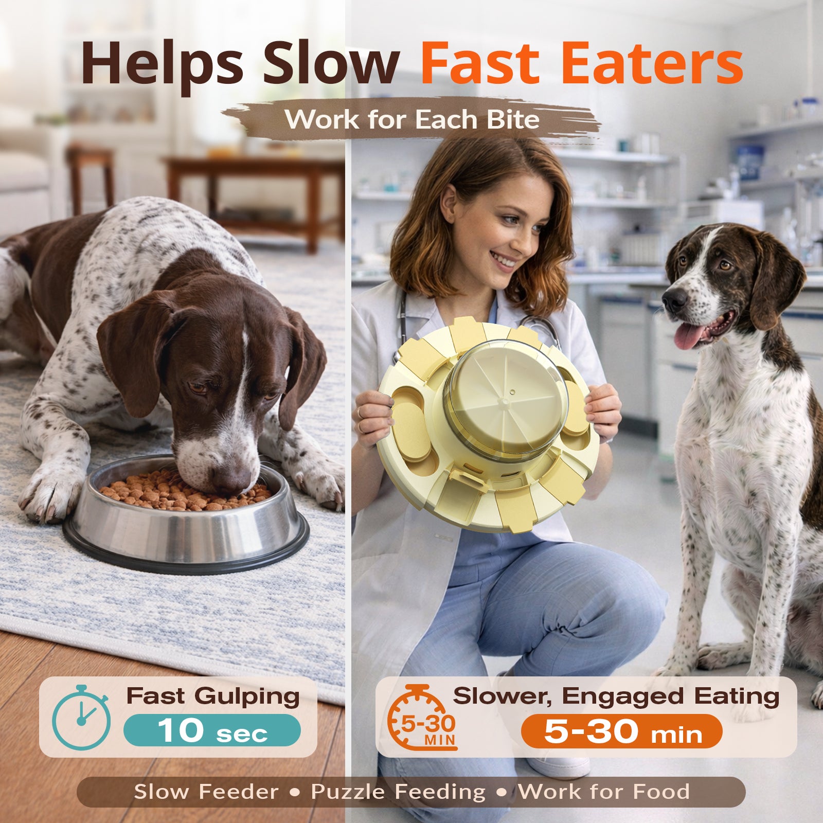 This is a dog toy that combines puzzles and slow feeding perfectly!This puzzle toy enhances pet intelligence and combines two difficulty levels. It solves dog boredom. It can replace the dog bowl as a slow feeding tableware for extend eating time and healthier digestion system. The toy features an innovative food supply design. Food is placed in the transparent granary and slides down to the food box through food channel when the dog presses the top cover. Then dog uses their paws or nose to open the food box lid and access the food. |